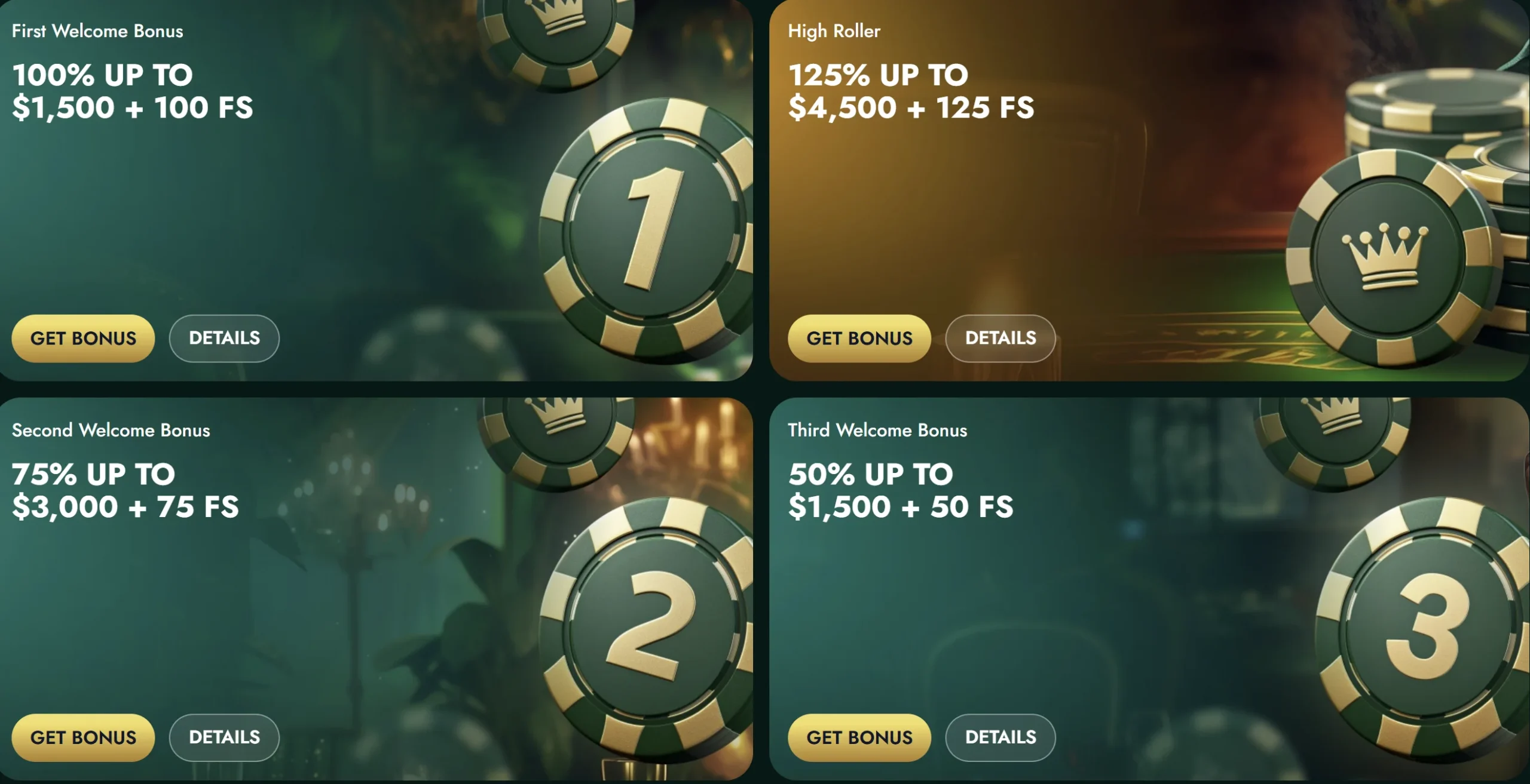 | Welcome package | Matched deposit + spins | Low–mid rollover on bonus | New accounts |