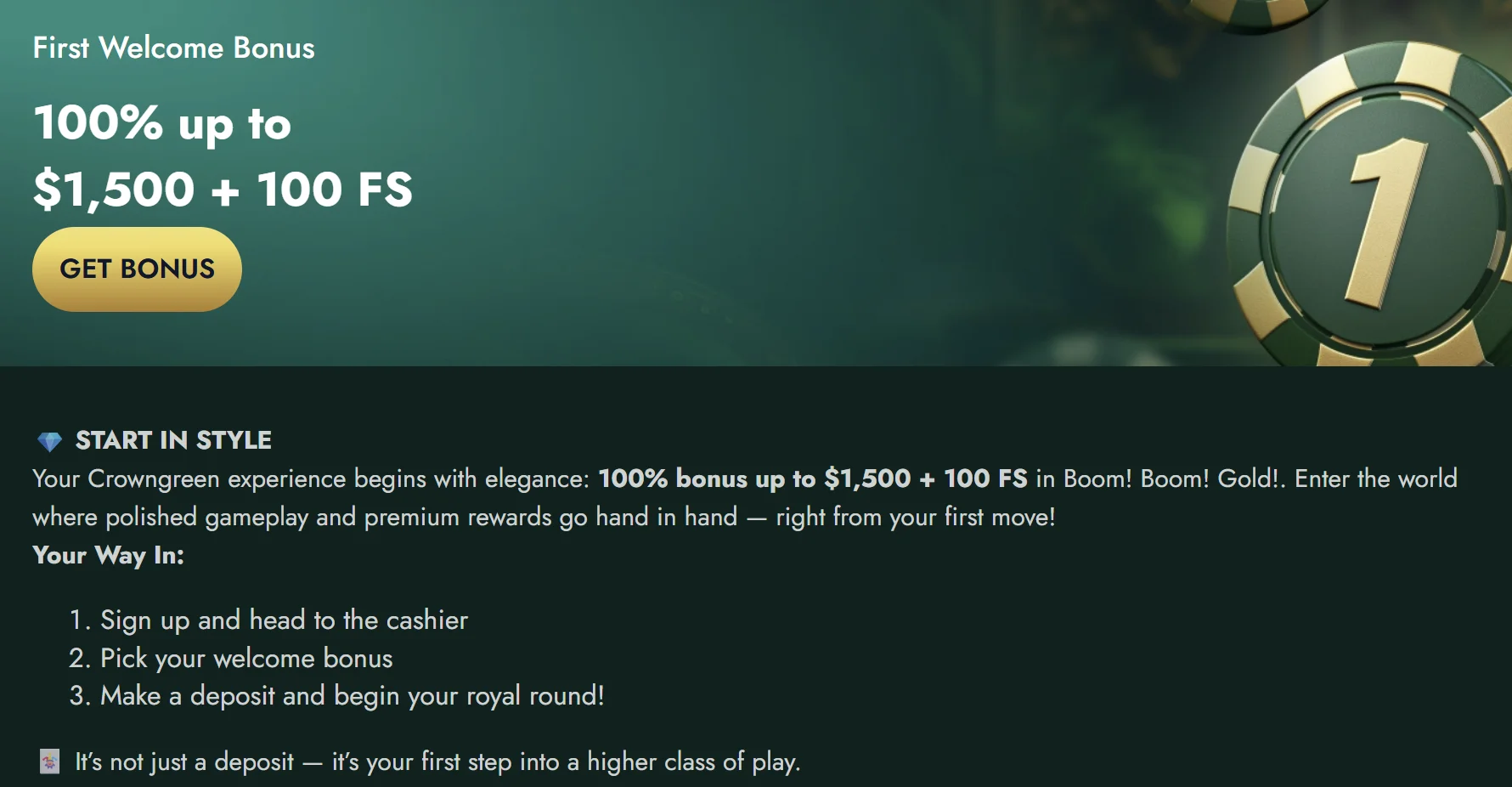 Check the welcome page for Crowngreen Casino Bonuses and verify your account.